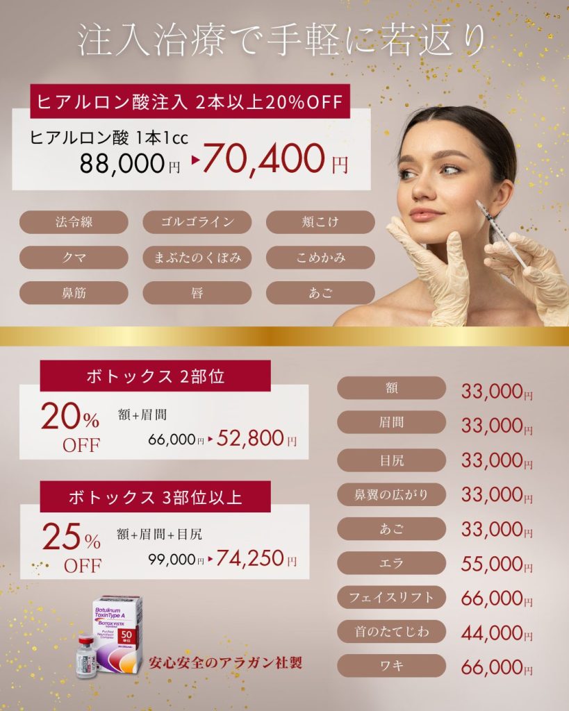 2025.10.06 ヒアルロン酸注入とボトックス注射は同日に複数本、複数個所されるのがおすすめです♪ 詳しくは添付画像をご確認ください。